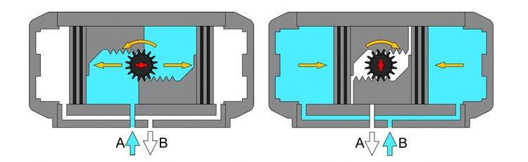- حرکت چرخشی (Rotary یا Quarter-turn): جک پنوماتیک وظیفه چرخاندن یک محور یا شیر را بر عهده دارد (مثلاً شیر توپی یا پروانهای که ۹۰ درجه گردش میکند).
